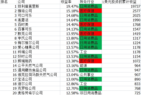 很顯著可以看出,通過50多年,最掙錢的職業十分會集,主要是日用消費品職業和醫療保健職業,壟斷了長時刻牛股的絕大多數。排行首位的是出產聞名卷煙品牌萬寶路的菲利普莫里斯公司,假如在1957年出資一萬元,到今天會變為1.97億元!適當的驚人。別的的長時刻大牛股也是咱們耳熟能詳的平時消費品和醫藥生物公司。